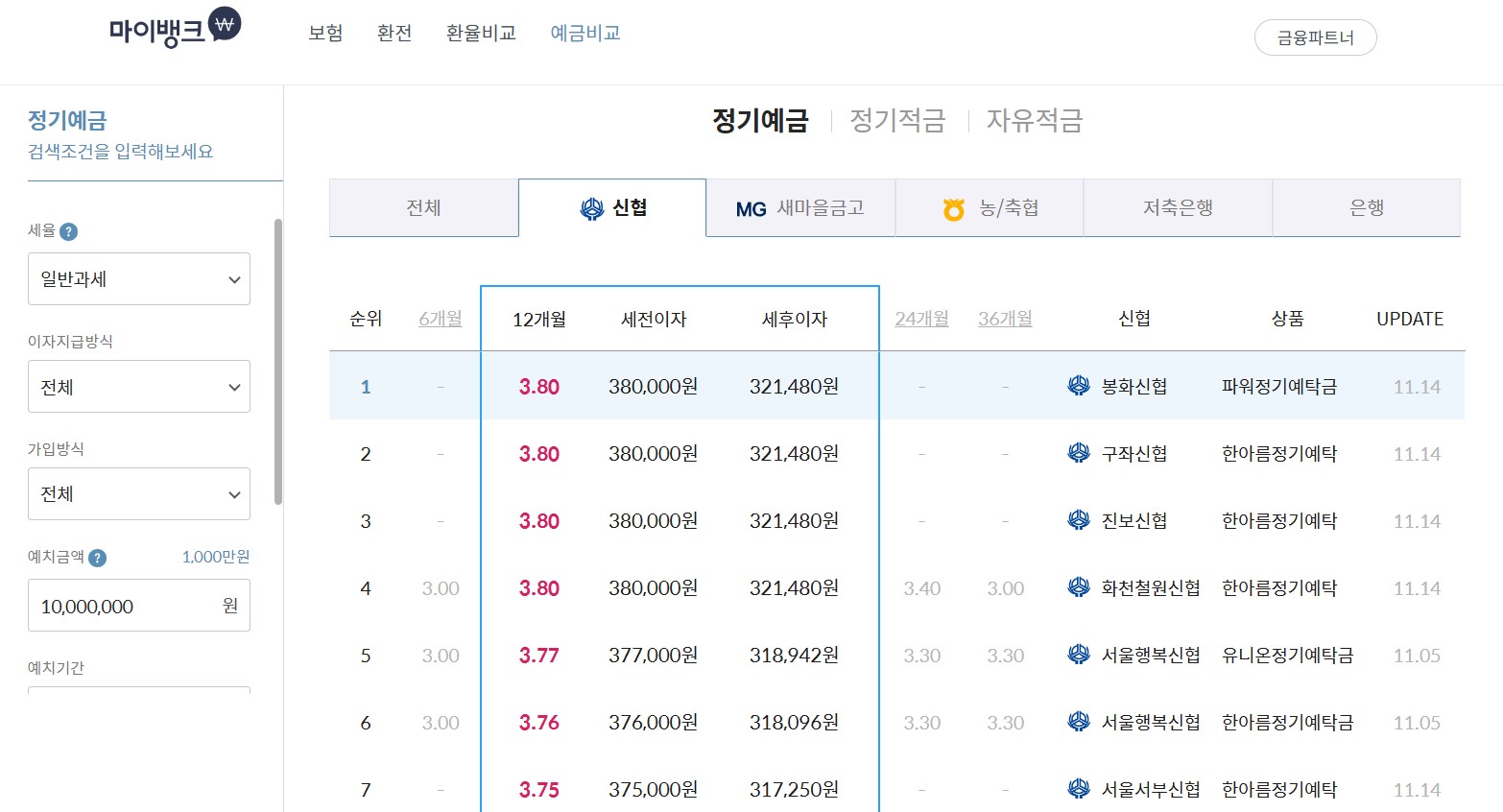 신협 역시 정기예금, 적금, 특별 예치 상품 등을 운영하며, 금리는 지점별로 다르게 책정됩니다. 2024년 현재 신협 정기예금 금리는 평균적으로 연 3.7%에서 4.8% 사이로 나타납니다.