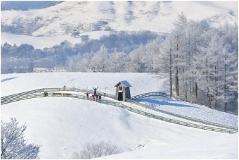 눈 덮인 대관령 양떼목장은 겨울 동화 같은 풍경을 선사합니다.